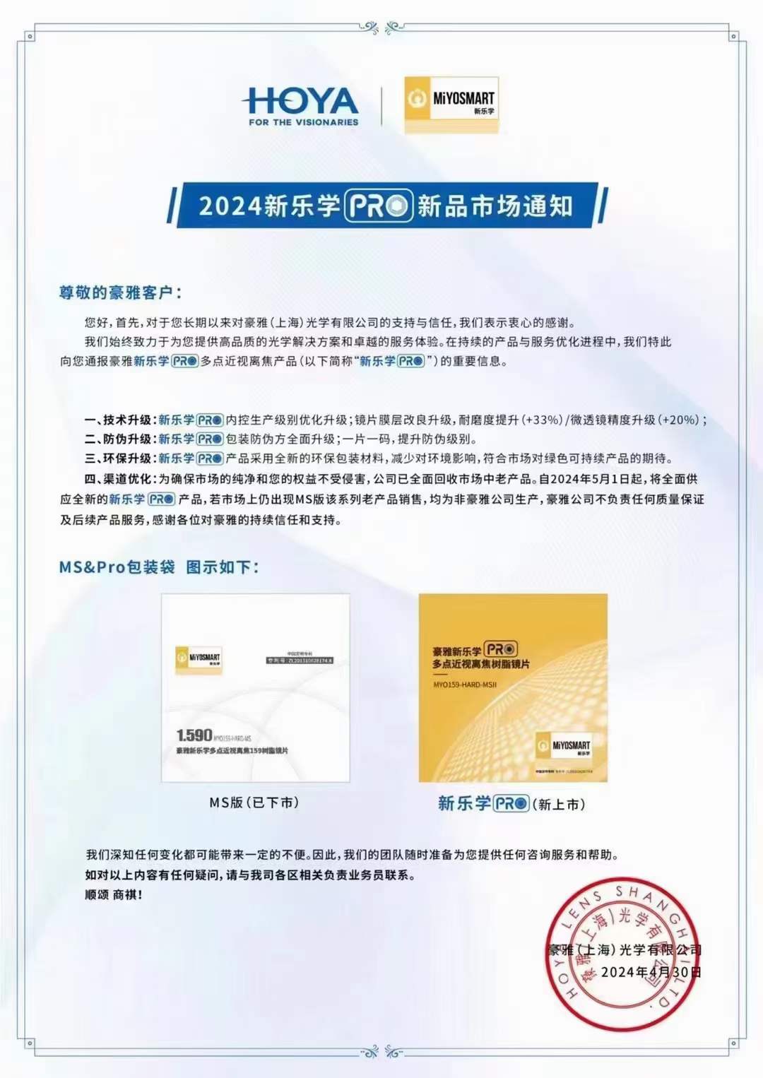 为确保市场的纯净和您的权益不受侵害,公司已全面回收市场中老产品(MS版)。自2024年5月1日起,将全面供应全新的新乐学(PRO)产品,若市场上仍出现MS版该系列老产品销售,均为非豪雅公司生产,豪雅公司不负责任何质量保证及后续产品 的服务,感谢各位对豪雅的持续信任和支持。